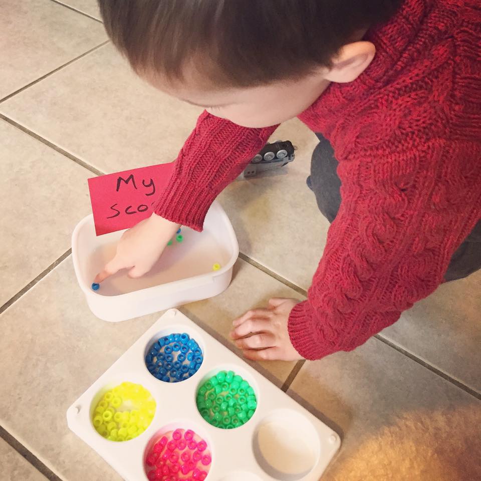 My son then had to figure out his total score at the end of the round by counting all of his beads. As time went on and he got better at aiming the addition became more complex. This is a game that now gets played most days and he loves the challenge of trying to beat Daddy's score.