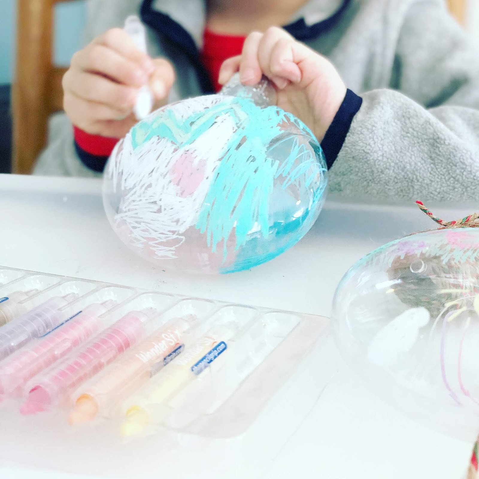 I love that when he wakes up in the morning he will most likely ask to wipe the baubles clean and design two new ones! Such an open-ended and festive creating activity!